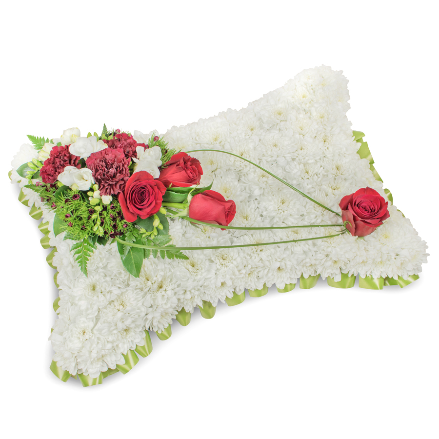 Express your deepest condolences with our stunning sympathy bouquet, meticulously crafted from hand-selected fresh flowers. The arrangement features white chrysanthemums, romantic red roses, pure white freesias, and dark red carnations, gracefully complemented by delicate dianthus and lush bear grass.