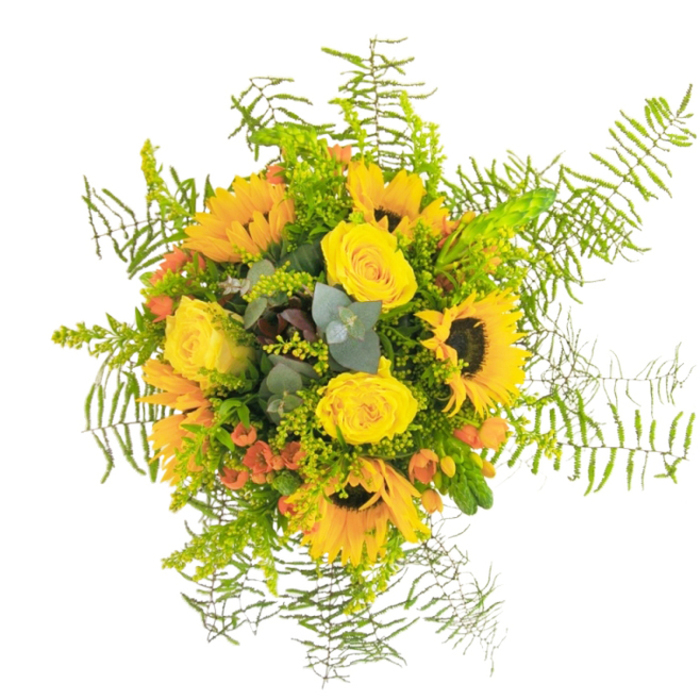 Just a simple look of this joyful combination of bright colours will bring anyone a good mood. There is no inappropriate time to make someone happy with a rich bunch of beautiful flowers including sunflowers, yellow roses, red hypericum, orange hypericum, yellow limonium, eucalypt and aspidistra leaves.